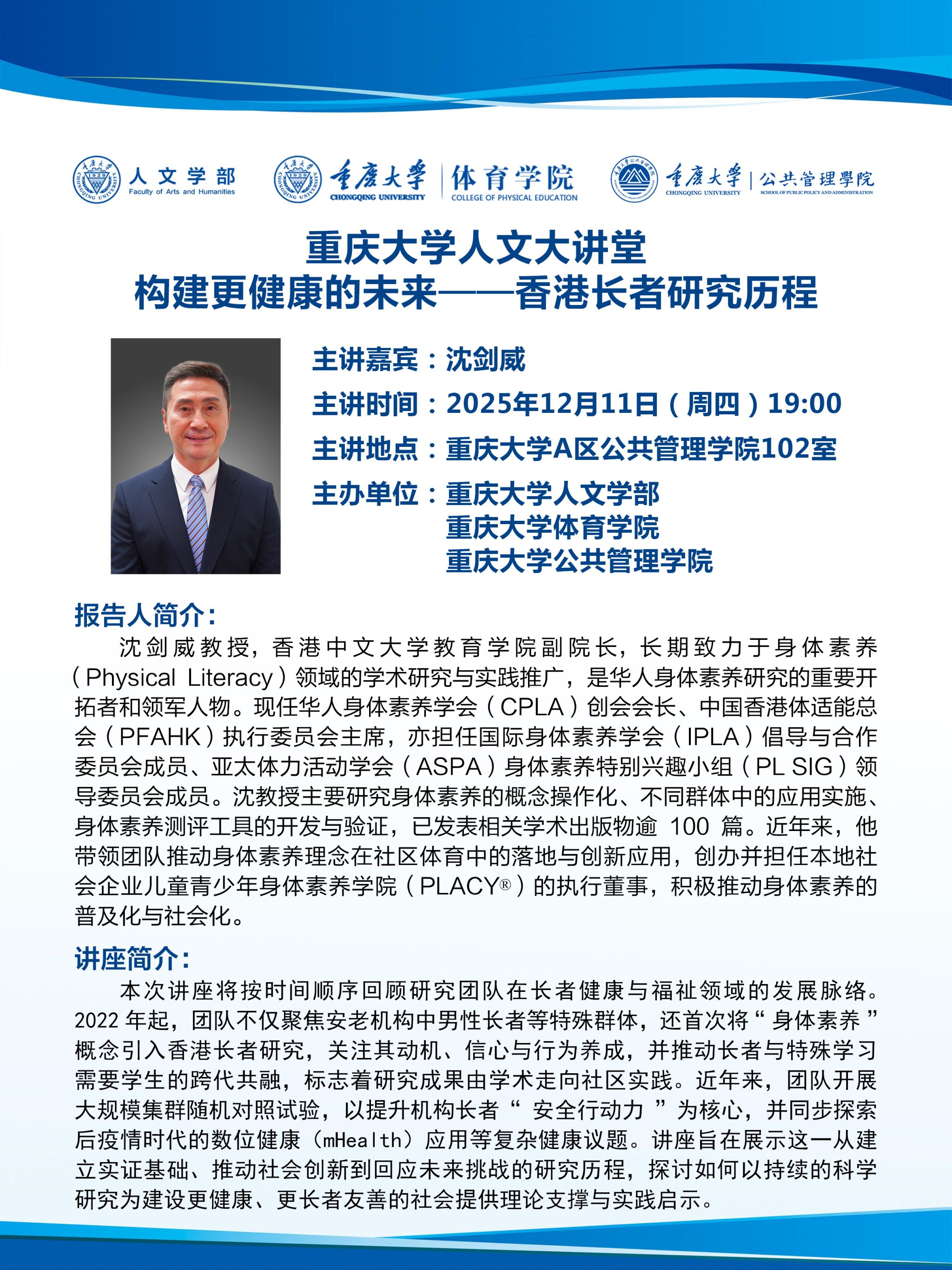 讲座目的、意义: 本次讲座不仅为体育学院师生提供深入了解老年人健康促进研究的契机,更为青年学者和未来体育教育工作者开拓了新的学术视野。通过回顾香港地区在长者健康促进领域的系统研究历程,讲座听众将能理解循证研究方法在体育与健康科学中的重要性,掌握如何将运动科学理论应用于社区与特殊群体服务,从而提升自身的专业素养与社会责任感。